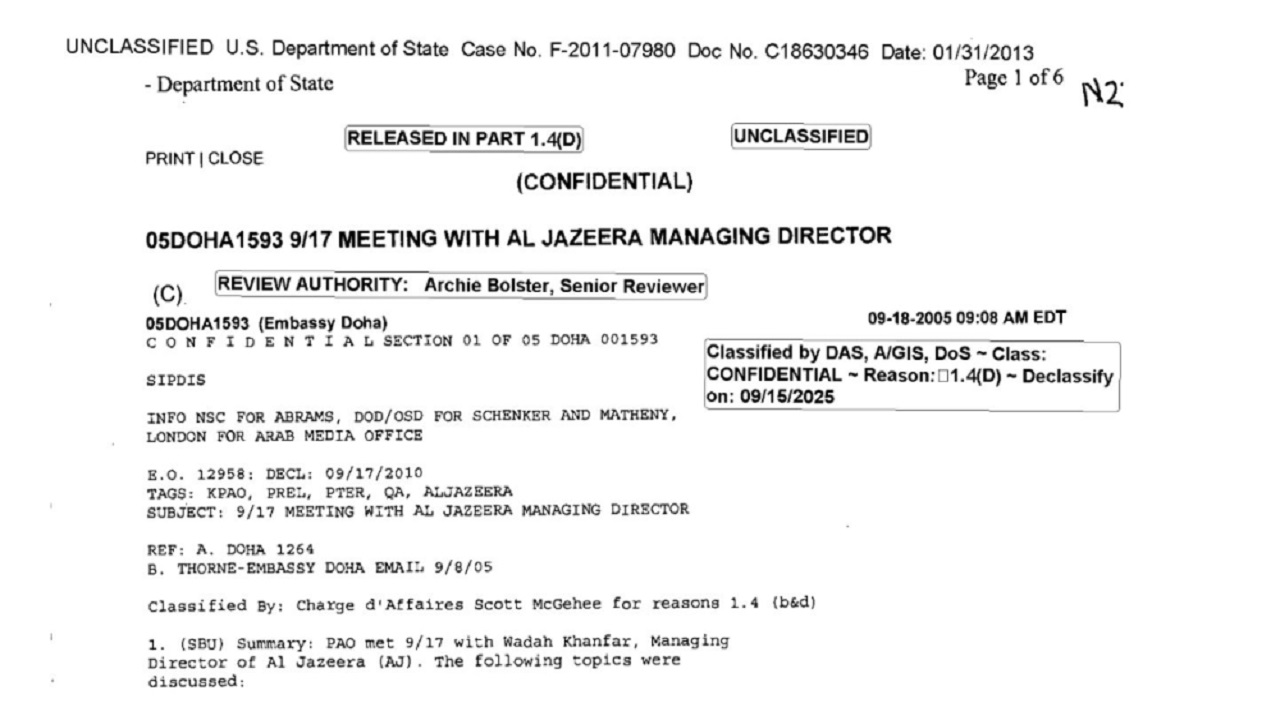 وشملت المباحثات التنسيق والاتفاق على زيارة وفد من «الجزيرة» إلى واشنطن في وقت لاحق في عام 2010، ولقاء مع رئيس الوزراء القطري السابق حمد بن جاسم آل ثاني، واستغلت هيلاري الزيارة لبث تقرير باللغة العربية يعرض على «الجزيرة» مدته 15 دقيقة يسلط الضوء على التزام الإدارة الأميركية تجاه المجتمعات المسلمة في العالم، بالإضافة إلى اجتماع مائدة مستديرة بين هيلاري والإعلام القطري المحلي، والذي ركز على العلاقات الثنائية بين إدارة أوباما والنظام الحاكم في قطر.