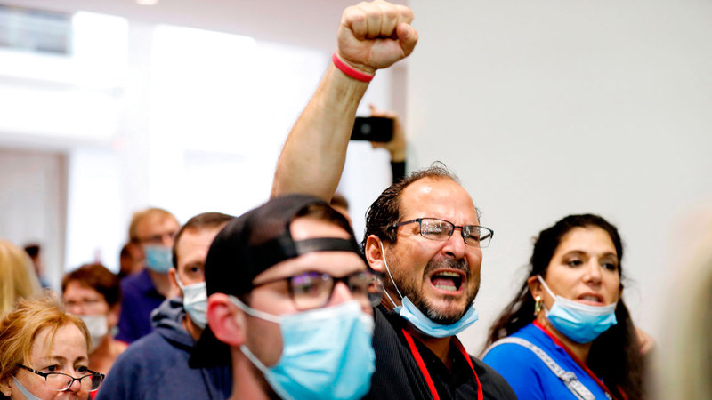 مؤيدون لترامب يهتفون خارج مركز لفرز الأصوات في ميشيغان. ■أ.ف.ب