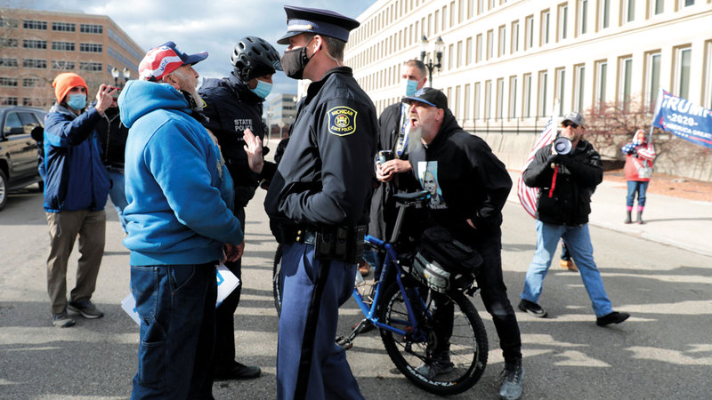 شرطة ولاية ميشيغان تفصل بين مناصرين لـ«بايدن» و«ترامب» خارج مقر التصديق على نتائج الانتخابات. رويترز