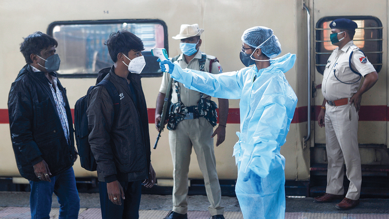 فحص درجة حرارة أحد الركاب بمحطة قطار في الهند. رويترز