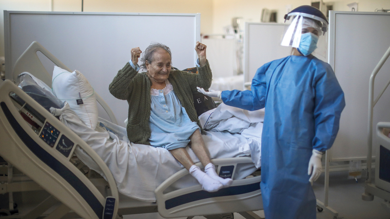 ثمانينية تحتفي بشفائها من «كورونا» في أحد مستشفيات الأرجنتين. أ.ب
