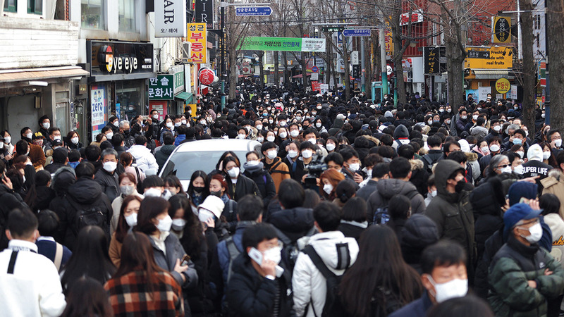 مشاة يرتدون أقنعة واقية بشارع مزدحم في سيؤول. إي.بي.إيه