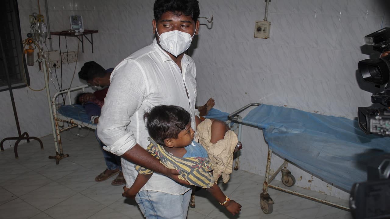 رجل يحمل طفلاً مصاباً بالمرض الغامض في ولاية أندرا براديش الهندية. (أ. ب)