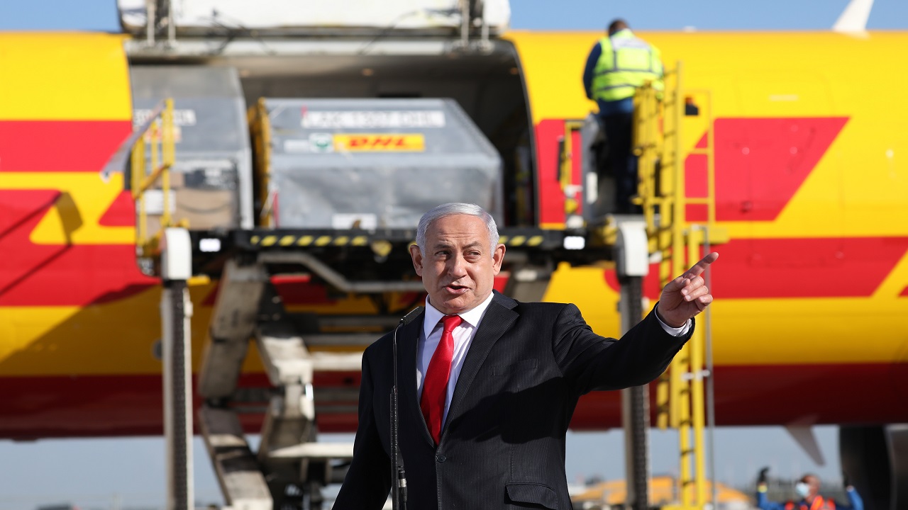 نتنياهو يحضر وصول جرعات اللقاح في مطار بن جوريون. (أ. ب)