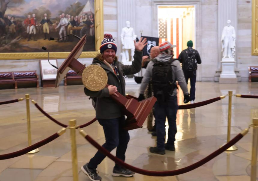 وانتشرت على نطاق واسع صورة آدام كريستيان جونسون وهو يبتسم ويلوح بيده حاملا منصة بيلوسي من غرفة بمجلس النواب.