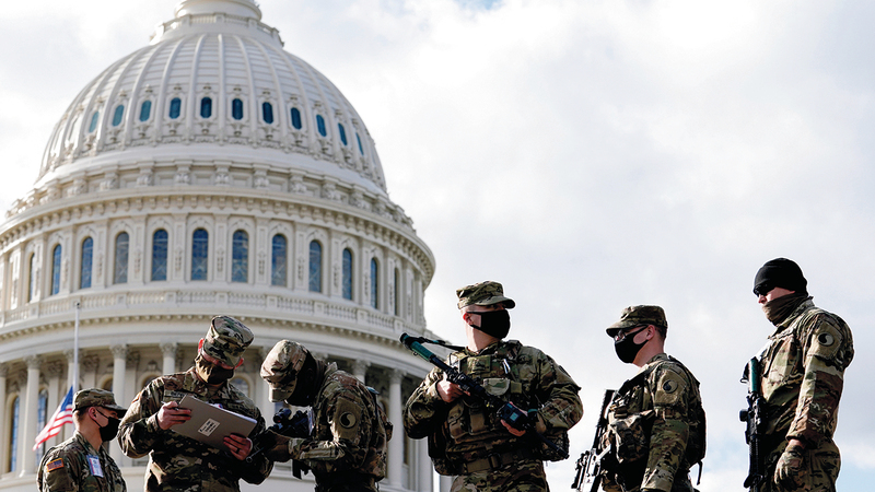 قوات الحرس الوطني خارج مبنى الكابيتول الأميركي استعداداً لاحتجاجات متوقعة بالتزامن مع تنصيب بايدن. رويترز