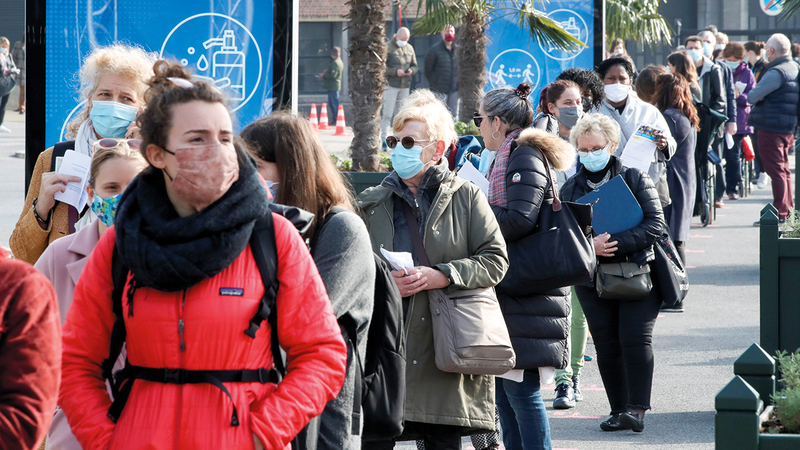 أشخاص يصطفون خارج أكبر مركز للتطعيم ضد «كورونا» في بروكسل ببلجيكا. رويترز