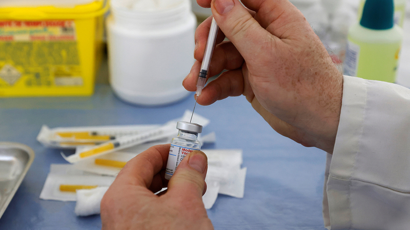 ممرض يحضّر حقنة بجرعة من لقاح «موديرنا» في مركز التطعيم في كاليه بفرنسا. رويترز