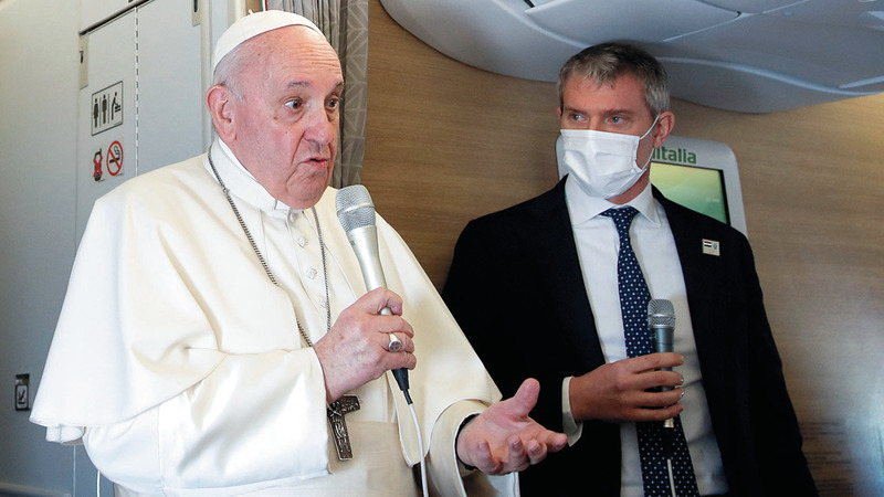 البابا يتحدث للإعلاميين في الطائرة بعد انتهاء الزيارة. رويترز