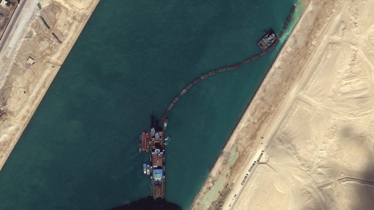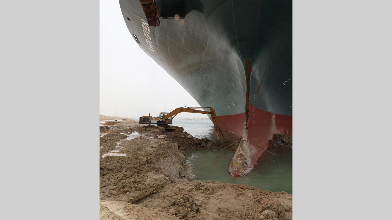 أظهرت صور جوية جديدة، التقطت عبر الأقمار الاصطناعية، محاولات تعويم السفينة التي يبلغ طولها 400 متر بعد أن جنحت في قطاع جنوبي القناة وسط رياح شديدة يوم الثلاثاء الماضي معطلة عمليات الشحن العالمية إثر غلق أحد أكثر الممرات البحرية ازدحاما في العالم، يبدو أن خطأ بشريا ارتكب وسبّب تلك الأزمة.