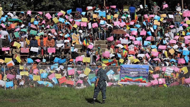 وملأ المحتجون ملعبا في العاصمة الإثيوبية خلال التجمع الداعم للحكومة، مرددين هتافات ضد العقوبات الأميركية وملوحين بلافتات تتهم "قوى أجنبية بالتدخل في الشؤون السيادية الإثيوبية".