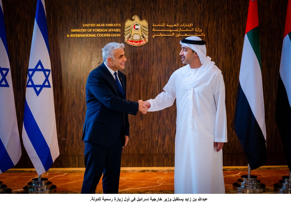 استقبل سمو الشيخ عبدالله بن زايد آل نهيان وزير الخارجية والتعاون الدولي، وزير خارجية دولة إسرائيل يائير لابيد وذلك في أول زيارة رسمية يقوم بها وزير خارجية إسرائيلي إلى الدولة.