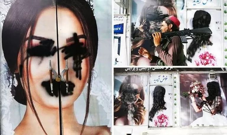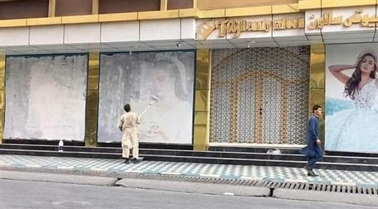 والثلاثاء، شوهدت جدران صالون آخر مغلق وقد رُشت بطلاء أسود لإخفاء محيا عارضاته المبتسمات، بينما مر أمامه مقاتل من حركة طالبان يقوم بدورية في الشارع وبندقيته على كتفه.