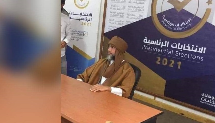 وقال عبد الحكيم الشعاب نائب رئيس مفوضية الانتخابات الوطنية في ليبيا إن "سيف الإسلام قدم أوراق ترشحه للانتخابات الرئاسية في مكتب المفوضية في مدينة سبها" جنوب غربي ليبيا، مؤكدا أنه "استكمل جميع المصوغات القانونية حسب قانون الانتخابات الرئاسية الصادر عن البرلمان".