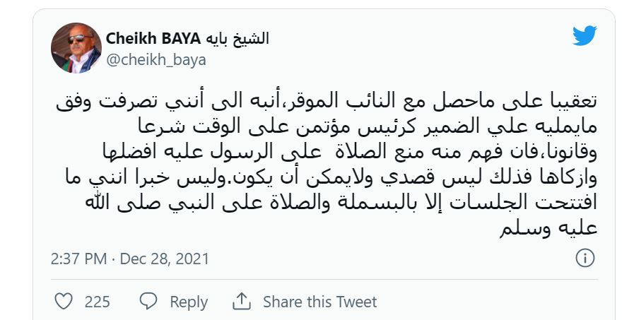وكان رئيس البرلمان قاطع النائب المعارض محمد بوي ولد الشيخ محمد فاضل أثناء مداخلته في جلسة مناقشة مشروع موازنة الدولة للعام 2022، وقال له:«ادعوك لعدم تكرار الصلاة على الرسول والاكتفاء بها مرة واحدة لأن فيها ضياعا للوقت».