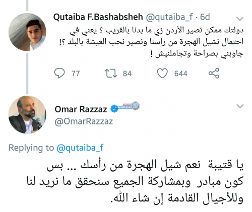 اعاد ناشطون اردنيون على موقع التواصل الاجتماعي تويتر، اطلاق وسم "#هاجر_يا_قتيبة" بعد اعلان جامعة هارفارد تعيين رئيس الوزراء السابق د.عمر الرزاز محاضرا غير متفرغ للدراسات الإستراتيجية والسياسية والاقتصادية والإجتماعية للشرق الأوسط.