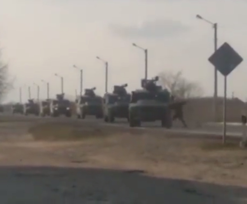 وأظهر الفيديو المتداول، قافلة عسكرية كبيرة، بينما يحاول الأوكراني اعتراض طريقها دون خوف على قدميه.