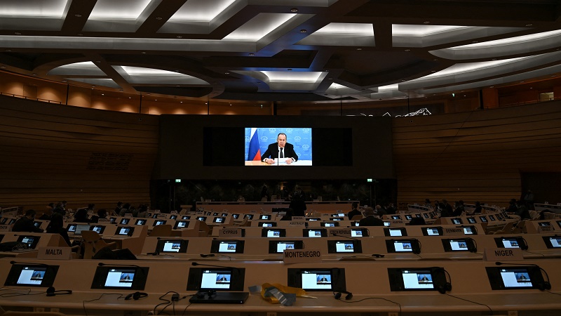 وغادر الدبلوماسيون القاعة عند بدء خطاب لافروف المسجل مسبقا على ما أفاد أحد صحافيي وكالة فرانس برس. وكان يفترض أن يحضر الوزير الروسي إلى جنيف إلا أنه ألغى مجيئه الاثنين بسبب "العقوبات المناهضة لروسيا" التي تمنعه من السفر في أجواء الاتحاد الأوروبي.