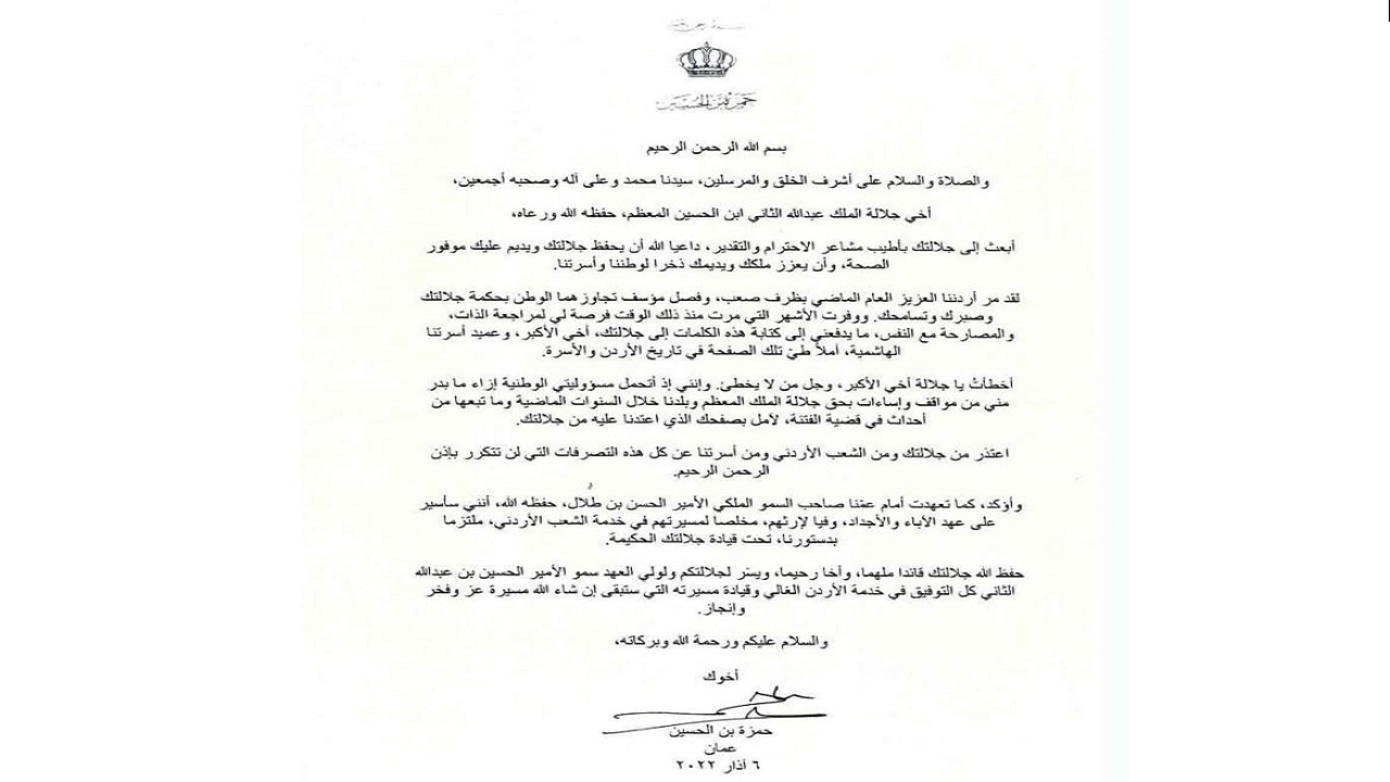 وأضاف: "لقد مرّ أردننا العزيز العام الماضي بظرف صعب، وفصل مؤسف تجاوزهما الوطن بحكمة جلالتك وصبرك وتسامحك. ووفرت الأشهر التي مرت منذ ذلك الوقت فرصة لي لمراجعة الذات، والمصارحة مع النفس، ما يدفعني إلى كتابة هذه الكلمات إلى جلالتك، أخي الأكبر، وعميد أسرتنا الهاشمية، آملاً طيّ تلك الصفحة في تاريخ الأردن والأسرة".
