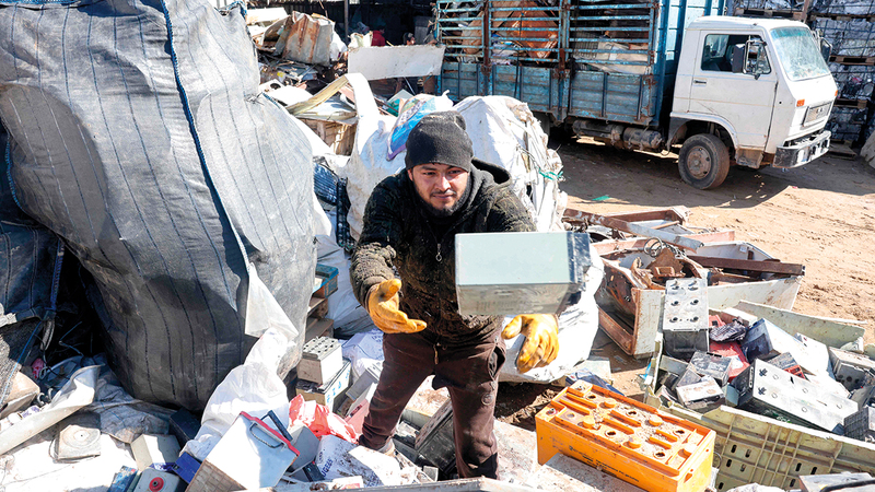 عند التاجر، تتكدّس أكوام من البطاريات تقدّر بالمئات، بالإضافة إلى أجهزة كهربائية وحديد في أرض مفتوحة تقف عند مدخلها عربات تجرها الحمير.