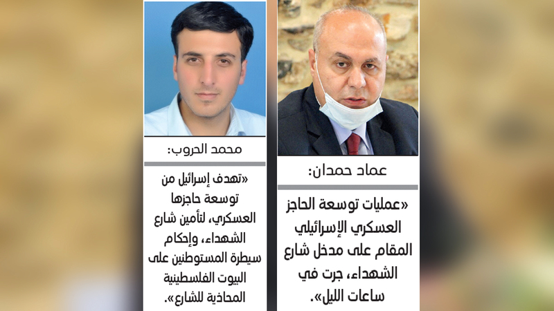 ويقول مدير لجنة إعمار الخليل عماد حمدان، في حديثه لـ«الإمارات اليوم» إن عمليات توسعة الحاجز العسكري الإسرائيلي المقام على مدخل شارع الشهداء، جرت في ساعات الليل من اليوم الثالث لشهر مارس الجاري، حيث نقلت آليات الاحتلال المكعبات الإسمنتية من أمام الحاجز العسكري، باتجاه باب الزاوية في البلدة القديمة، في مسافة بلغ طولها 50 متراً.