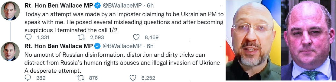 تمكن محتال من إيقاع وزير الدفاع البريطاني بن والاس في مصيدة فخ نصبه له أمس الخميس، حين اتصل به وأخبره أنه دينيس شميهال رئيس وزراء أوكرانيا، وفقا لما ذكر الوزير بتغريدة على "تويتر" بحسب ما ذكر لصحيفة "التايمز" المحلية.