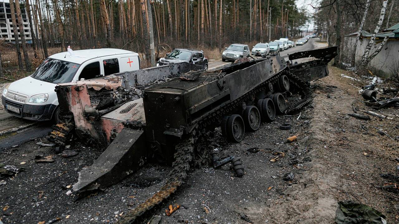 آلية عسكرية روسية مدمرة في ضواحي كييف. (أ. ب)
