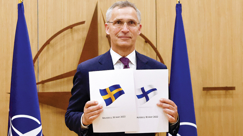 السكرتير العام لحلف الناتو ينس ستولتنبرغ خلال الاحتفال بتقديم طلب الانضمام للعضوية من قبل كل من السويد وفنلندا في بروكسل. أ.ف.ب