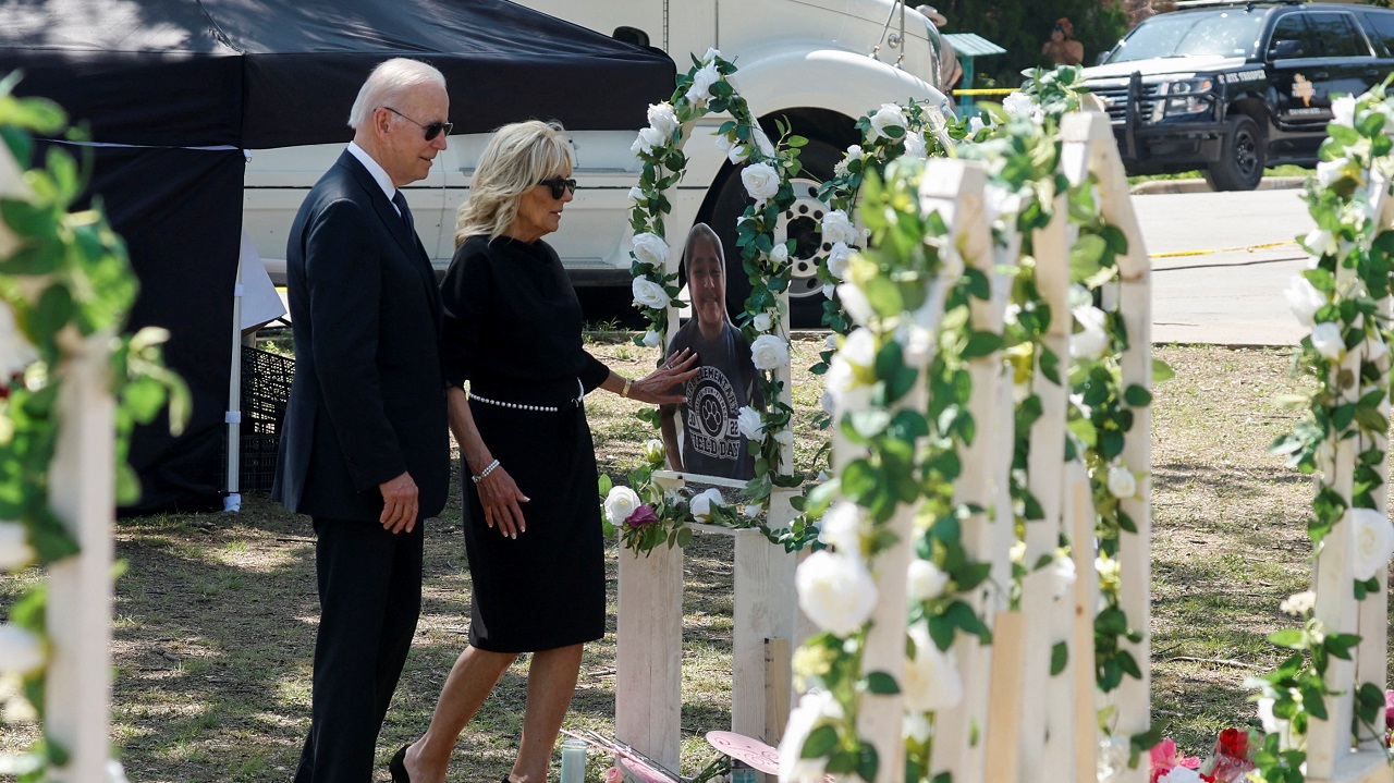 وزار بايدن برفقة زوجته جيل المدرسة التي قتل فيها شاب، 19 طفلا ومعلمتين يوم الثلاثاء الماضي، ووضع بايدن وزوجته إكليلا من الزهور أمام المدرسة ووقفا صامتين لبرهة.