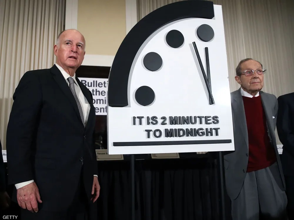 أعلن مسؤولون عن "ساعة القيامة" انه لم يعد يفصل العالم عن قيام حرب نووية سوى دقيقتان فقط؛ بتوقيت هذه الساعة الرمزية.