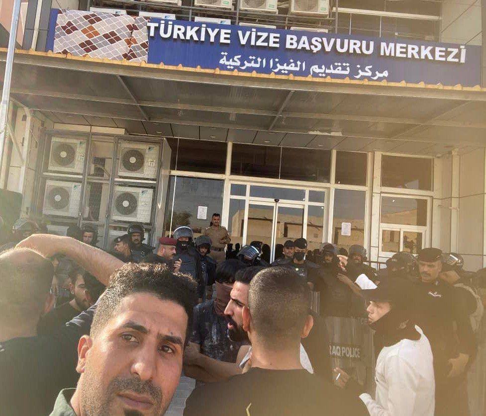 وتظهر الصور ومقاطع الفيديو تجمع كبير من المواطنين أمام مركز تقديم الفيزا التركية في محافظة النجف.