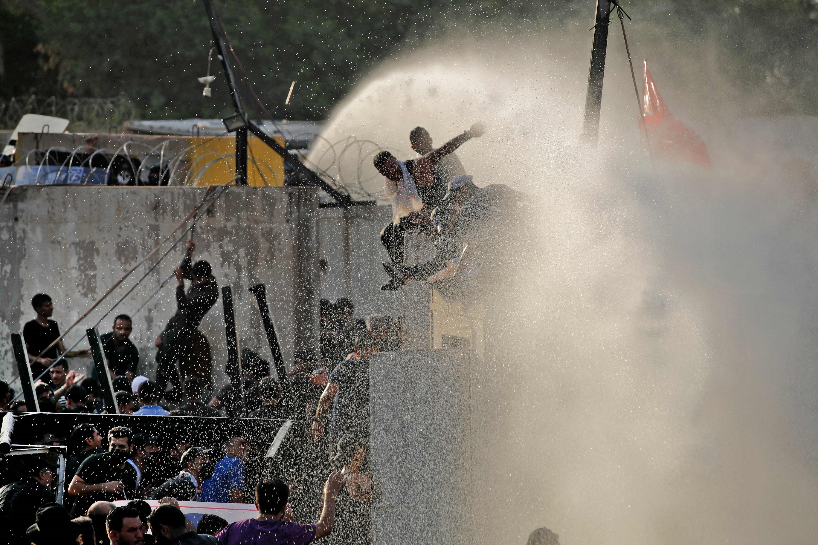 واستخدمت القوات المسلحة العراقية خراطيم المياه لمنع اقتراب المتظاهرين من الحواجز الإسمنتية والأسلاك الشائكة المحيطة بالبوابة الجنوبية للمنطقة الخضراء الحكومية.