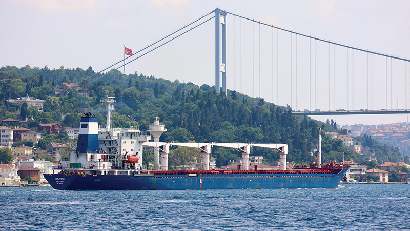 سفينة الحبوب الأوكرانية «رازوني» تبحر عبر البوسفور بعد اكتمال تفتيشها في إسطنبول. رويترز