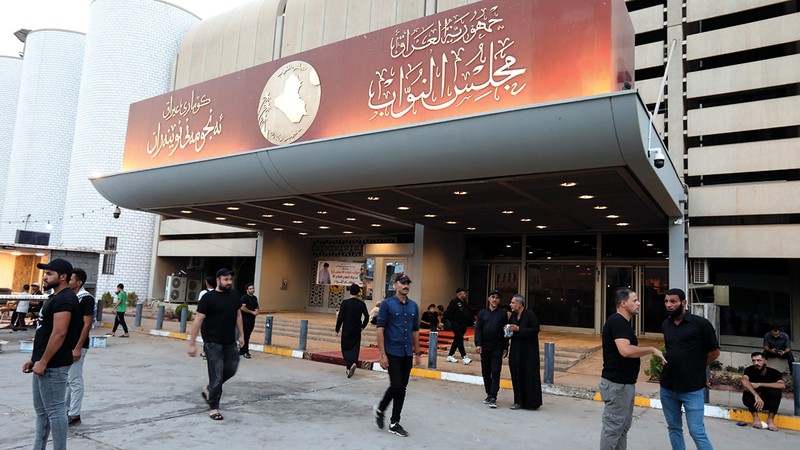 أنصار مقتدى الصدر يسيرون بجوار مبنى البرلمان العراقي في بغداد. إي.بي.إيه