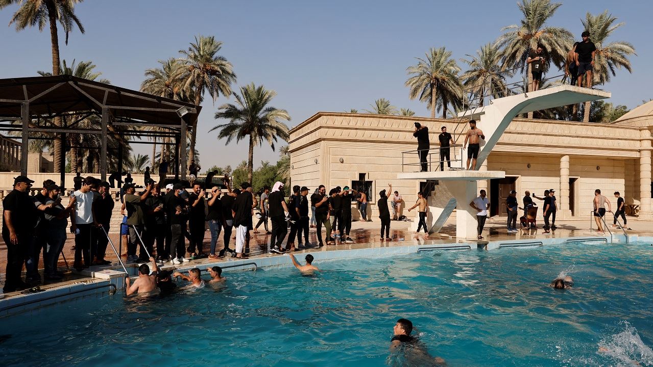 أنصار الصدر بعد اقتحامهم القصر الحكومي في بغداد. (رويترز)