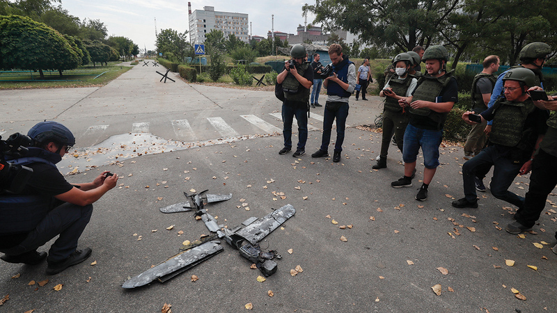 مصوّرون يلتفّون حول طائرة مسيرة سقطت بالقرب من محطة زابوريجيا النووية. إي.بي.إيه