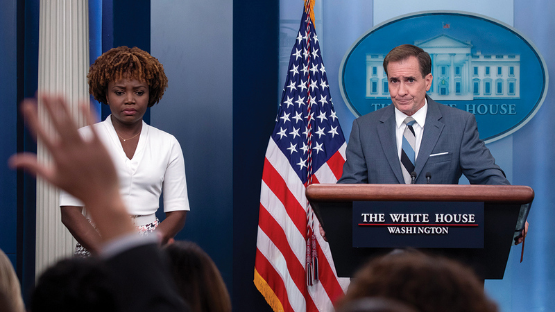 جون كيربي وكارين جان بيير في مؤتمر صحافي بالبيت الأبيض. إي.بي.إيه