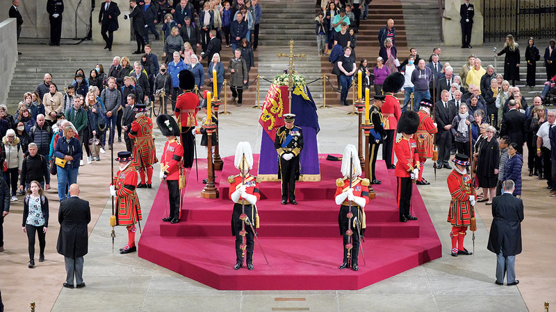 وداخل القاعة التي يوجد بها نعش الملكة الراحلة، أمس، بكى بعض المعزين، بينما كان بعض الجنود الحاليين والمحاربين القدامى يؤدون التحية لقائدتهم السابقة.