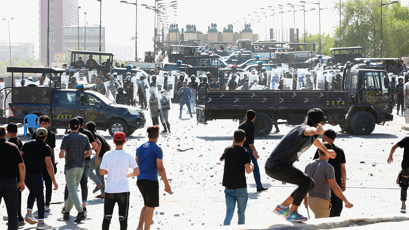 متظاهرون يرشقون قوات الأمن بالحجارة أثناء محاولتهم دخول المنطقة الخضراء في بغداد. إي.بي.إيه