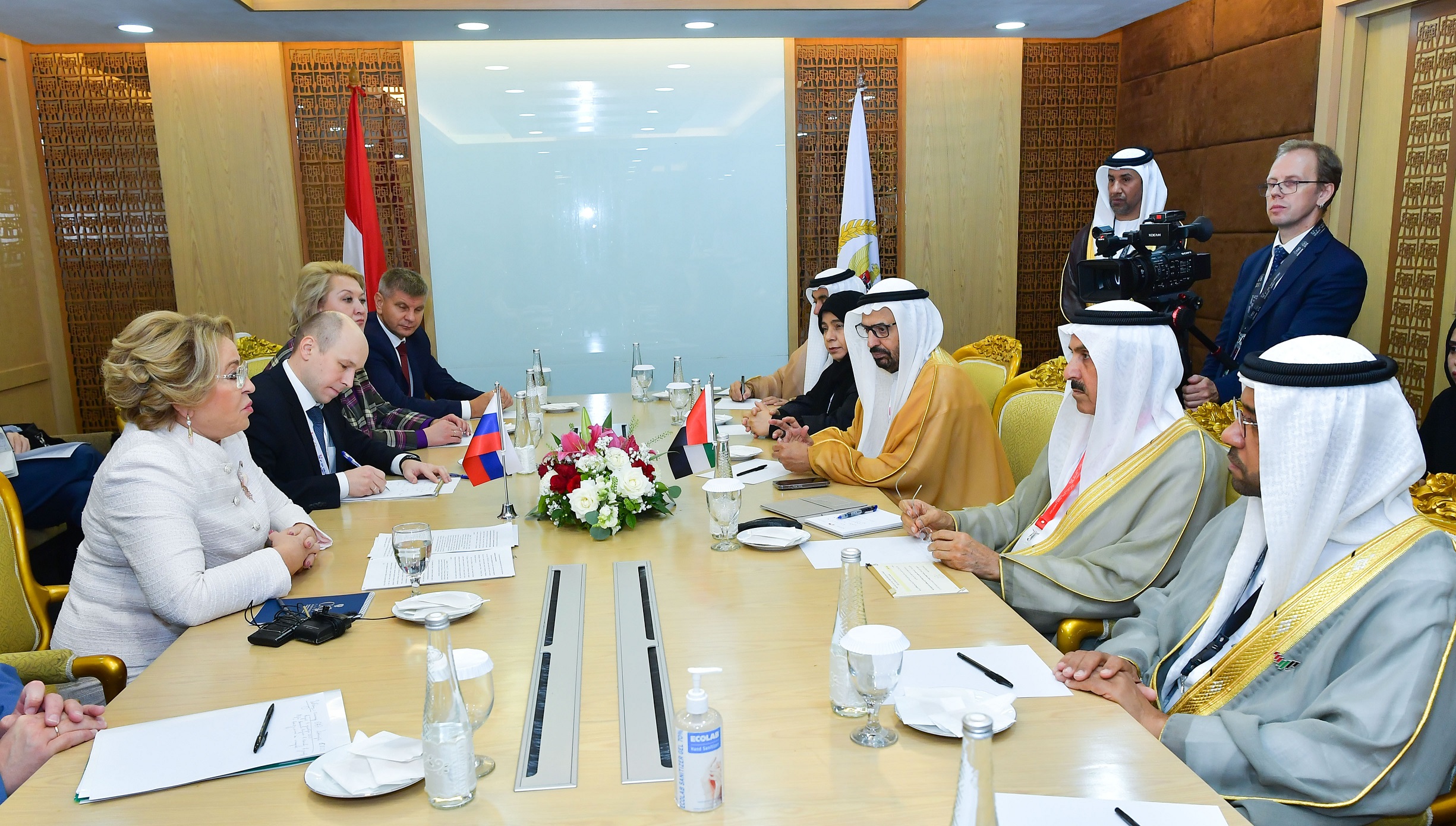 بدورها أكدت فالنتينا ماتفيينكو، أهمية أن تواكب العلاقات البرلمانية علاقات الشراكة الاستراتيجية بين البلدين، وما تشهده من تطور على مختلف الصعد الاقتصادية والتجارية والثقافية والطاقة والتكنولوجيا، حيث تعد دولة الإمارات من أهم الدول العربية في التجارة الروسية والوجهة الأولى عربياً للاستثمارات الروسية، وفي المقابل فإن الإمارات هي أكبر مستثمر عربي في روسيا، كما تتميز بارتفاع نسبة السياحة المتبادلة بين مواطني البلدين.