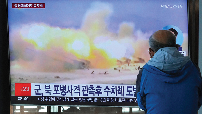 شاشة تلفزيونية في سيؤول تعرض صورة لإطلاق كوريا الشمالية قذائف مدفعية بالقرب من حدودها البحرية مع «الجنوبية». أ.ب