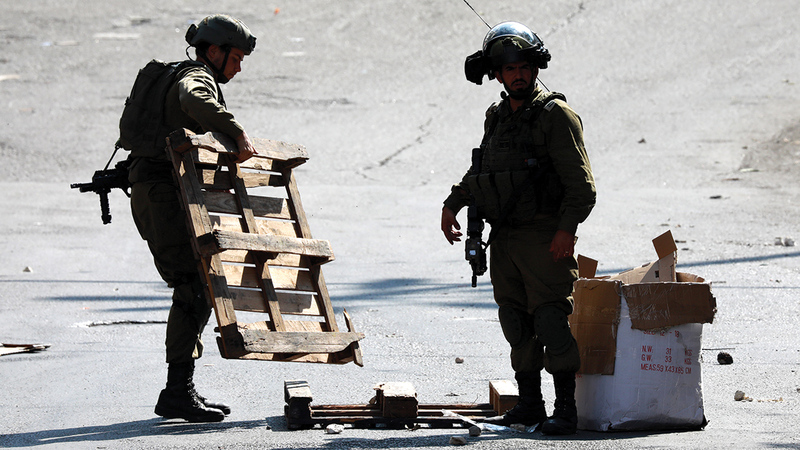جنديان إسرائيليان يتخذان موقعهما خلال مواجهات مع فلسطينيين في مدينة الخليل بالضفة الغربية. إي.بي.إيه