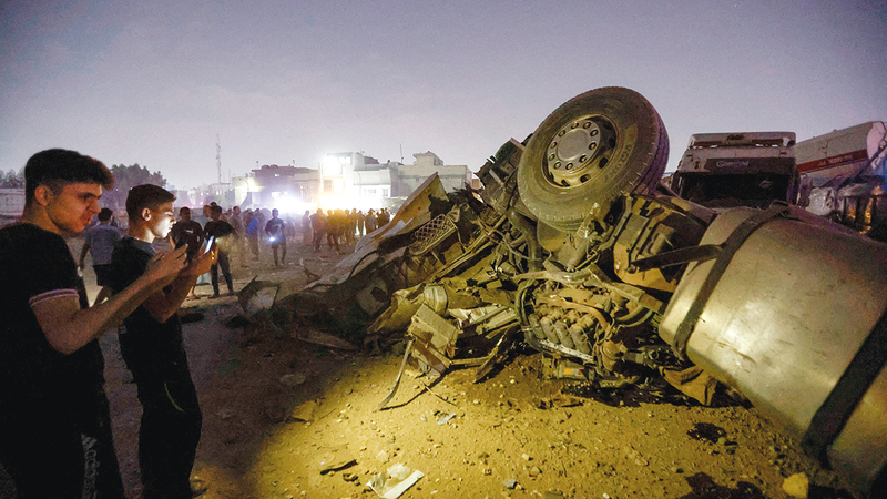 عراقيون يتفقدون موقع انفجار صهريج الوقود في بغداد. رويترز