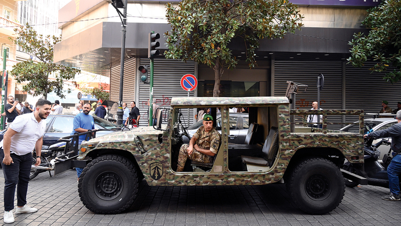 رجال شرطة وجنود يتجمعون خارج فرع بنك بيبلوس بعد أن اقتحم مودع الفرع. إي.بي.إيه