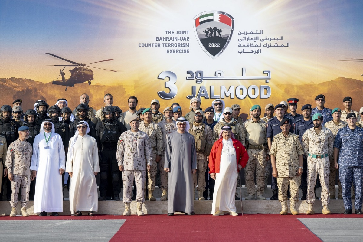 شهد صاحب السمو الشيخ محمد بن زايد آل نهيان رئيس الدولة "حفظه الله" والملك حمد بن عيسى آل خليفة عاهل مملكة البحرين الشقيقة اليوم المرحلة الختامية من التمرين الإماراتي ــ البحريني المشترك لمكافحة الإرهاب "جلمود 3".