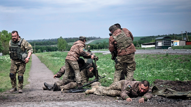 جنود أوكرانيون يساعدون زملاءهم المصابين في دونباس. أ.ف.ب