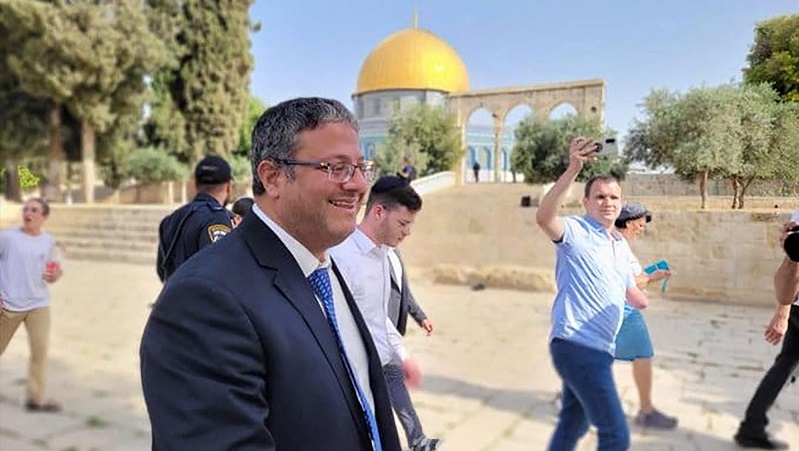 إيتمار بن غفير خلال تواجده في فناء مجمع المسجد الأقصى. (أ. ف. ب)