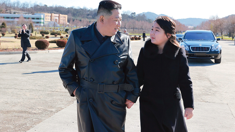 صورة أرشيفية تظهر كيم جونغ، وابنته، يسيران إلى جلسة تصوير إطلاق صاروخ باليستي. أ.ب