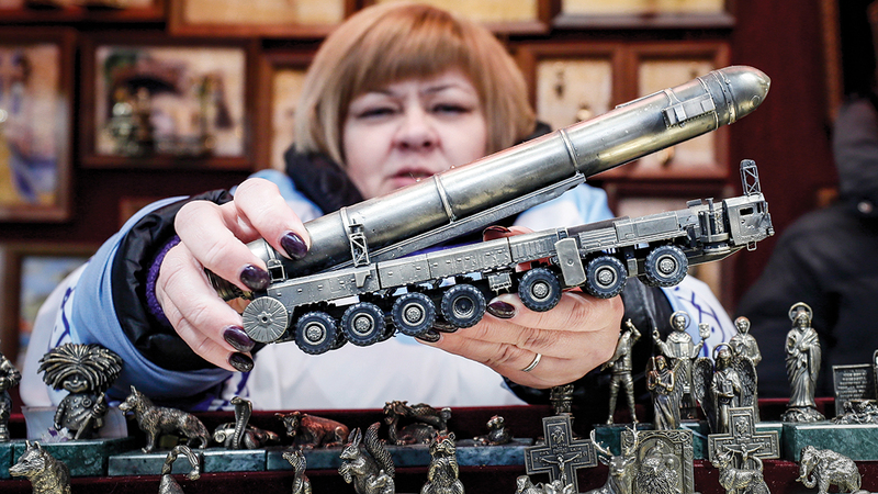 روسية تبيع نموذجاً للصاروخ الاستراتيجي الروسي العابر للقارات «توبول إم» في الساحة الحمراء في موسكو. إي.بي.إيه
