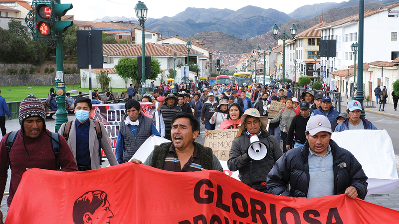 تدفق المواطنون على عاصمة بيرو، كثير منهم من مناطق الأنديز النائية، للاحتجاج أمس ضد الرئيسة دينا بولوارت ودعماً لسلفها، الذي أدى خلعه الشهر الماضي إلى اضطرابات دموية، وألقى بالبلاد في فوضى سياسية.